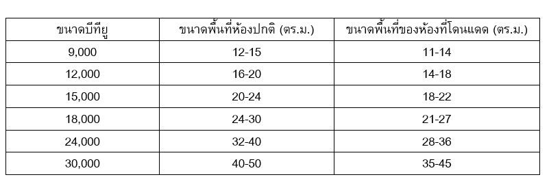 แต่หากขนาดบีทียูต่ำเกินไป จะทำให้คอมเพรสเซอร์ทำงานหนัก เพราะไม่สามารถทำความเย็นได้ตามอุณหภูมิที่ตั้งไว้ สิ้นเปลืองพลังงานขึ้นกว่าเดิมเช่นกัน และอายุการใช้งานก็จะสั้นลงการเลือกขนาดบีทียูให้เหมาะสมกับพื้นที่ห้อง (ตารางเมตร)