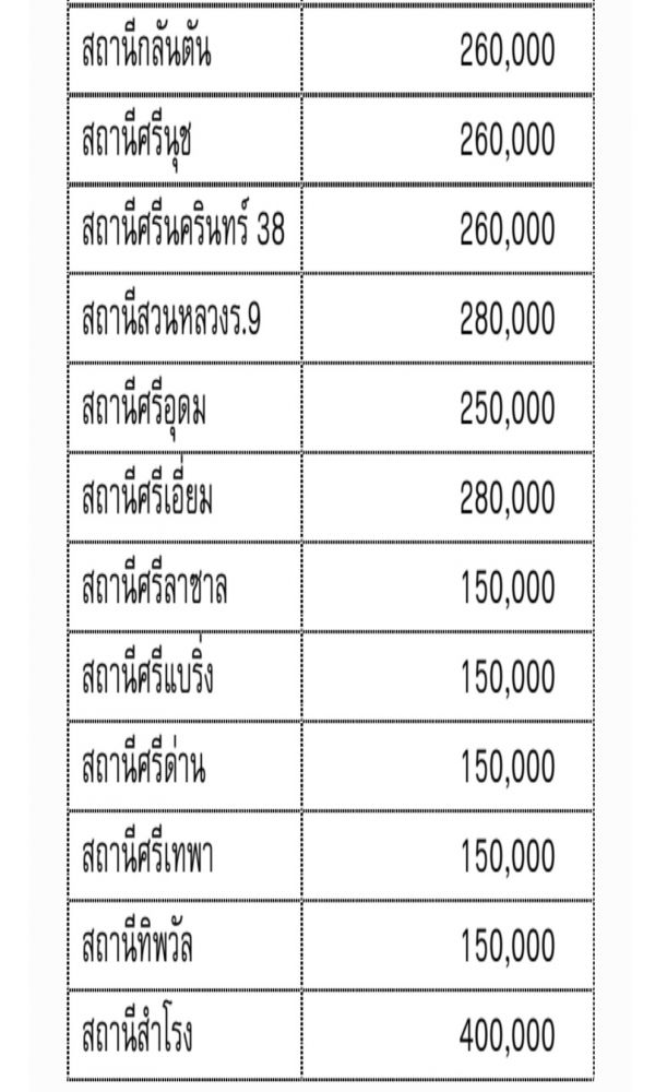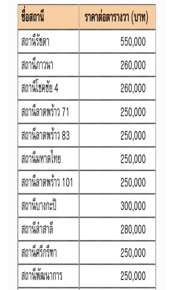 สำหรับราคาที่ดินตามสถานีรถไฟฟ้า จำนวน 23 สถานี มีดังนี้ สถานีที่มีราคาสูงสุดคือ “สถานีรัชดา” อยู่ที่ 5.5 แสนบาท/ตารางวา