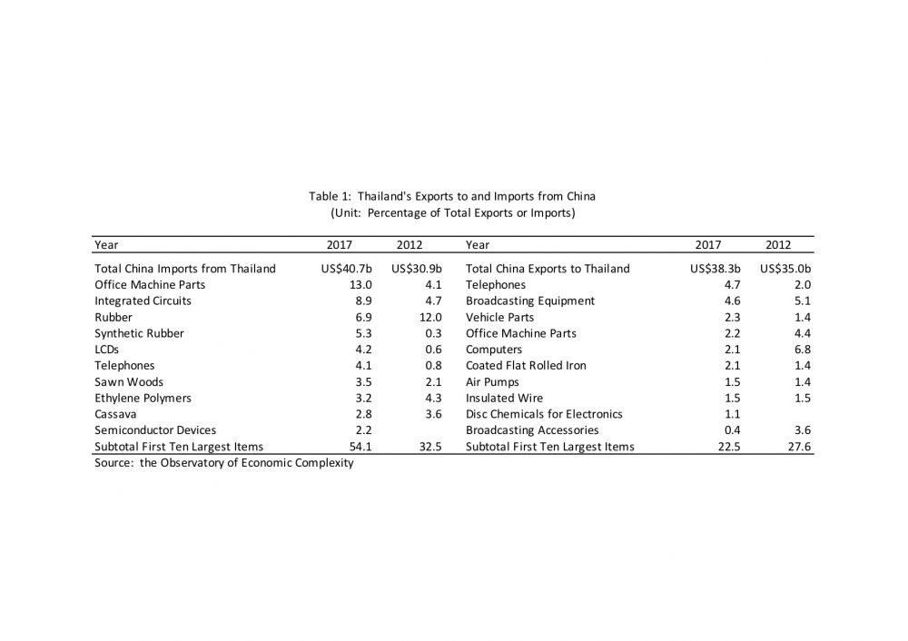 บรรทัดแรกของตารางที่ 1 แสดงมูลค่าการส่งออกของไทยไปจีนและมูลค่าการนำเข้าของไทยจากจีนในปี 2017 และ 2012 ตามลำดับ การส่งออกของไทยไปจีนขยายตัวประมาณ 32% ระหว่างสองปีดังกล่าวและการนำเข้าของไทยจากจีน ขยายตัวเพียง 9% ในช่วงเดียวกัน แต่ว่าอัตราการขยายตัวทางเศรษฐกิจของจีนในช่วงดังกล่าว ลดลงจาก 7.9% เป็น 6.9% ต่อปี