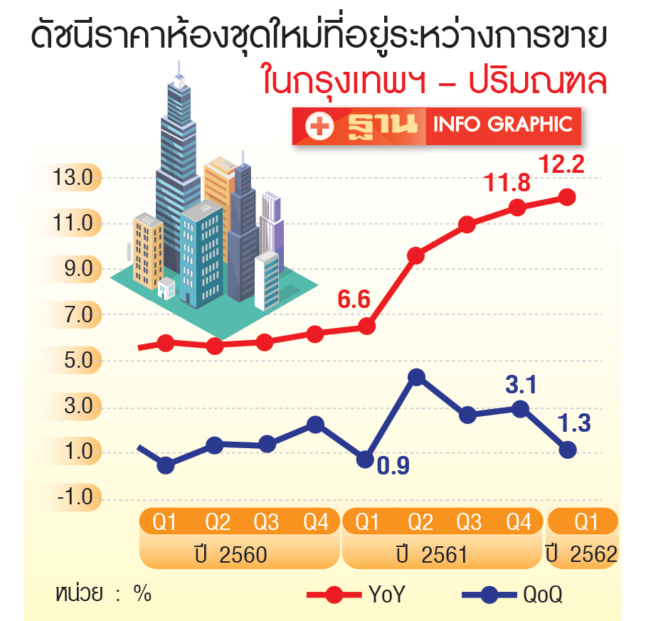 ตลาดคอนโดมิเนียมในกรุงเทพฯและปริมณฑล ช่วงไตรมาส 1 ปี 2562 ถึงแม้อยู่ในภาวะโอเวอร์ซัพพลาย ผู้ประกอบการก็ยังเดินหน้าเปิดขายโครงการใหม่ต่อเนื่อง แต่ไม่หวือหวานัก กระนั้นก็ตามภาพรวมดัชนีราคาห้องชุดใหม่ที่อยู่ระหว่างการขายปรับเพิ่มขึ้นประมาณ 12% เมื่อเทียบกับช่วงเวลาเดียวกันของปีก่อน