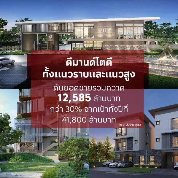 ส่งผลให้บริษัทฯ สามารถสร้างยอดขายได้แล้ว 30% จากเป้ายอดขายปี 2562 ที่ตั้งไว้ที่ 41,800 ล้านบาท มั่นใจไตรมาส 2 ตลาดอสังหาฯ ระดับกลางถึงบนดีมานด์ดีต่อเนื่อง พร้อมรุกตลาดเตรียมเปิดโครงการใหม่ทั้งสิ้น 13 โครงการ มูลค่ารวม 19,720 ล้านบาท