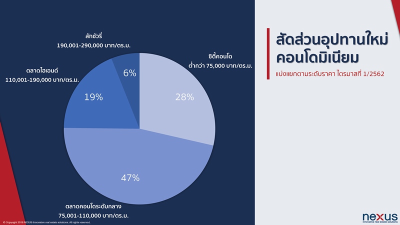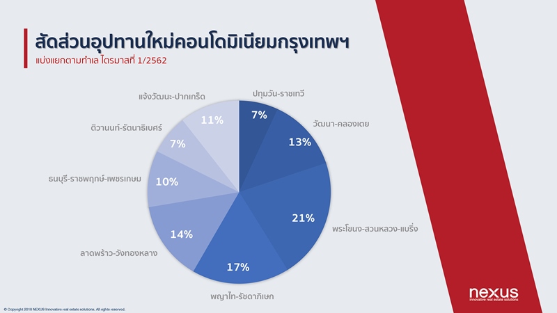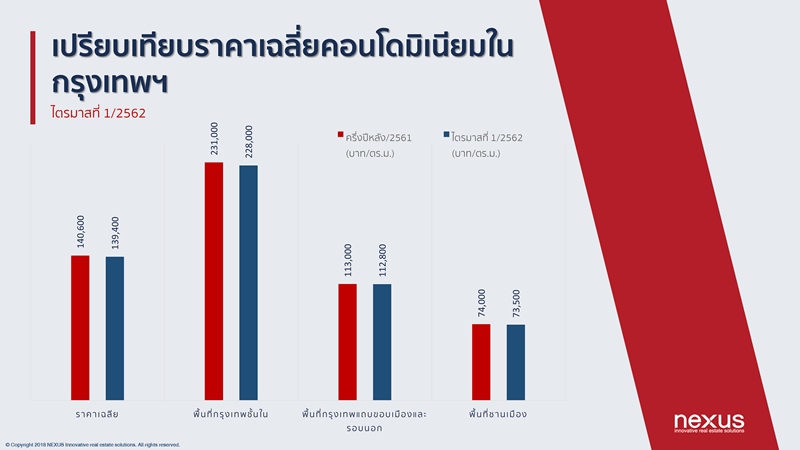 นางนลินรัตน์ เจริญสุพงษ์ กรรมการผู้จัดการ บริษัท เน็กซัส พรอพเพอร์ตี้ มาร์เก็ตติ้ง จำกัด (Mrs. Nalinrat Chareonsuphong, Managing Director of Nexus Property Marketing Company Limited) เผยว่า ผลสำรวจตลาดคอนโดมิเนียมในกรุงเทพช่วงไตรมาสที่ 1 ของปี 2562