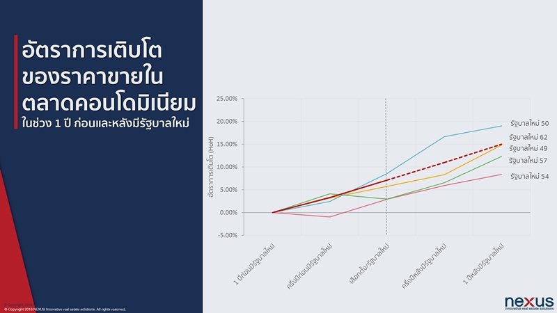หากจะกล่าวถึงการปรับตัวของตลาดหลังจากมีการจัดตั้งรัฐบาลใหม่ในช่วงหลายปีที่ผ่านมา พบว่า การปรับตัวของราคายังคงปรับตัวสูงขึ้นอย่างต่อเนื่อง ปัจจัยที่มีผลกระทบต่อตลาดมากกว่าในแต่ละช่วงเวลาจะเป็นนโยบายของรัฐบาลที่จะกระตุ้นธุรกิจหรือลดความร้อนแรงของธุรกิจมากกว่า