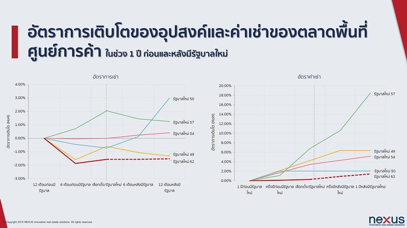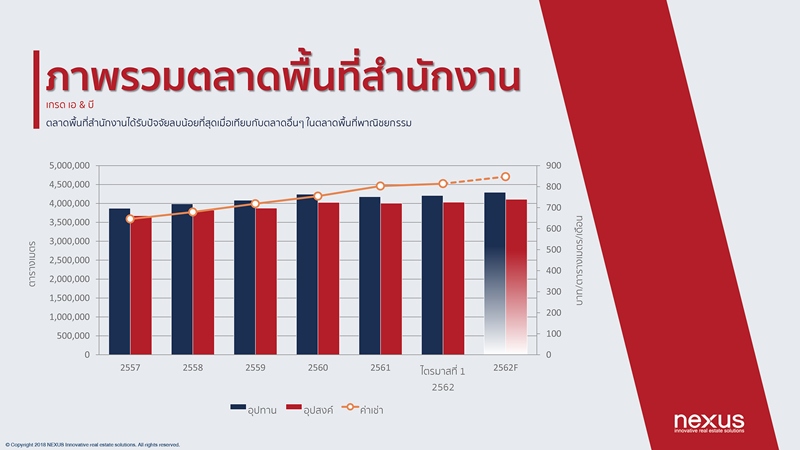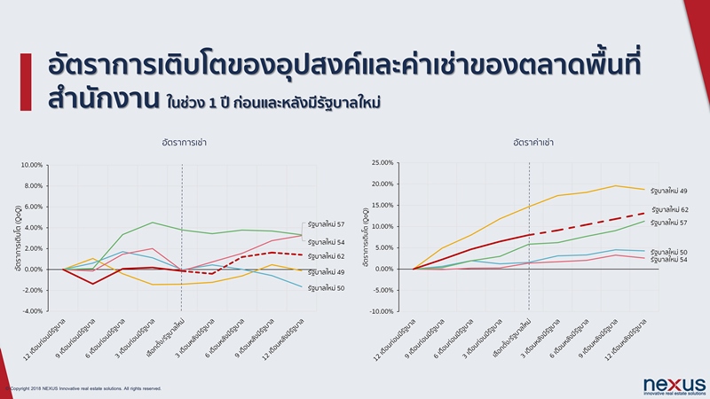 ซึ่งเห็นได้จากการเติบโตอย่างต่อเนื่องของทั้งอัตราการเช่าและอัตราค่าเช่าจากกระยะก่อนและหลังการมีรัฐบาลใหม่ในแต่ละครั้งที่ผ่านมา เน็กซัสฯ คาดว่าตลาดพื้นที่สำนักงานยังคงมีทิศทางที่ดีอย่างต่อเนื่องและจะยังมีแนวโน้มการเติบโตของตลาดที่ดีต่อไป