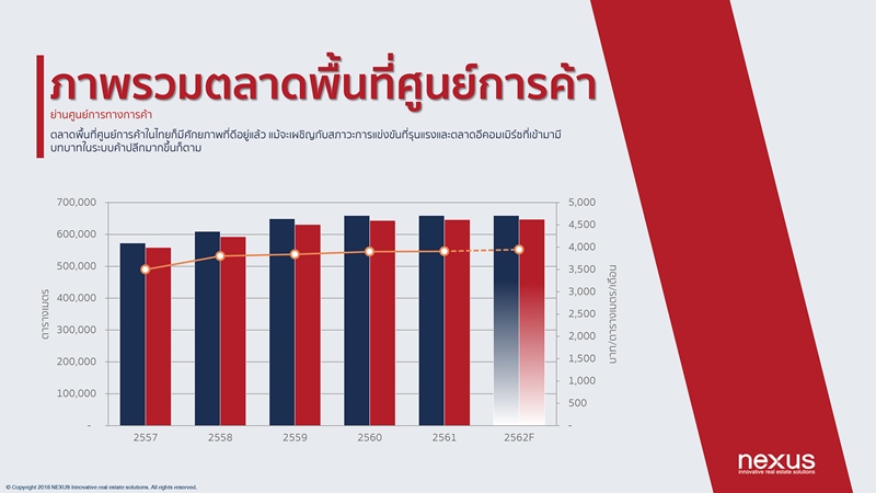 จากการสำรวจของเน็กซัสฯ พบว่าพื้นที่ศูนย์การค้าที่เกิดขึ้นใหม่ของไตรมาสนี้ มาจาก 101 เดอะเธิร์ดเพลส เดอะมาร์เก็ต แบงคอก บาย แพลตินั่ม และ ดอง ดอง ดองกิ รวมพื้นที่เช่าทั้งสิ้นประมาณ 70,000 ตารางเมตร โดยในปีนี้คาดว่าจะมีพื้นที่ศูนย์การค้าเพิ่มขึ้นอีกกว่า 140,000 ตารางเมตร และยังมีพื้นที่ศูนย์การค้าที่อยู่ในช่วงก่อสร้างและอยู่ในระหว่างแผนการดำเนินงานอีกจำนวนมาก