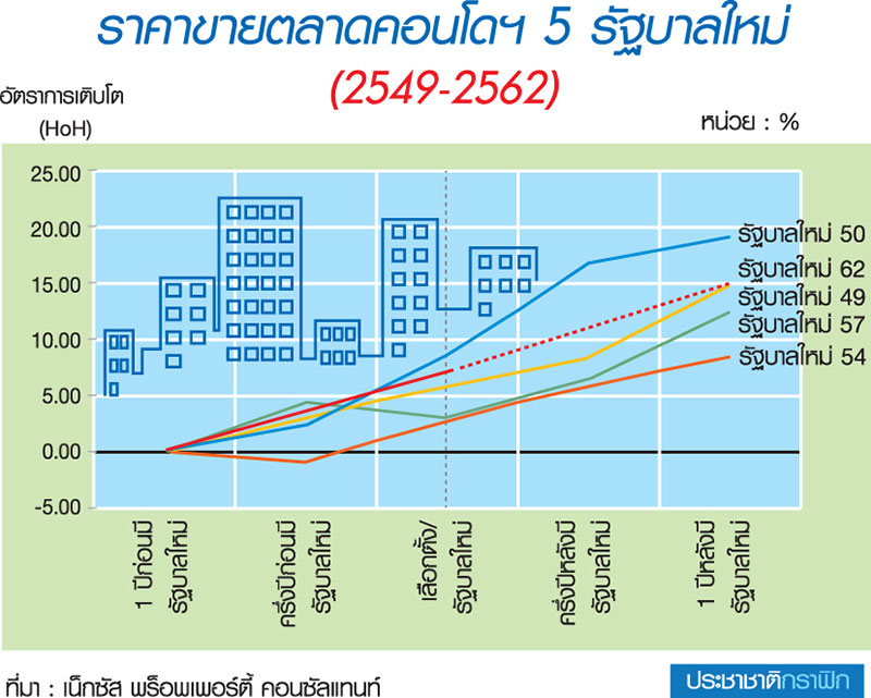 รายละเอียดดังนี้ รัฐบาลใหม่ในปี 2549 ราคาอสังหาฯเติบโต 15%, รัฐบาลใหม่ปี 2550 ราคาอสังหาฯขยับไปเติบโตอยู่ที่ 18-19%, รัฐบาลใหม่ปี 2554 ตลาดหลักในกรุงเทพฯเผชิญภาวะมหาอุทกภัย ทำให้ราคาดร็อปลงมาเติบโต 8%, รัฐบาลใหม่ปี 2557 ซึ่งเป็นปีรัฐประหารโดย คสช. เส้นกราฟก็กลับไปยืนเหนือ 10% ได้