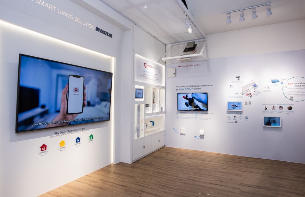 1. SCG Smart Living Solution: โซนที่ส่งมอบการอยู่อาศัยที่มีคุณภาพและชาญฉลาดด้วยเทคโนโลยีทันสมัยเชื่อมต่อด้วยระบบ IOT เข้ากับระบบของสินค้าต่าง ๆ ที่ช่วยให้การอยู่อาศัยเป็นไปอย่างสะดวกสบายและใช้ชีวิตอย่างมีความสุขยิ่งขึ้นซึ่งประกอบด้วยระบบที่ตอบสนองความต้องการให้กับเจ้าของบ้านใน 4 ด้าน