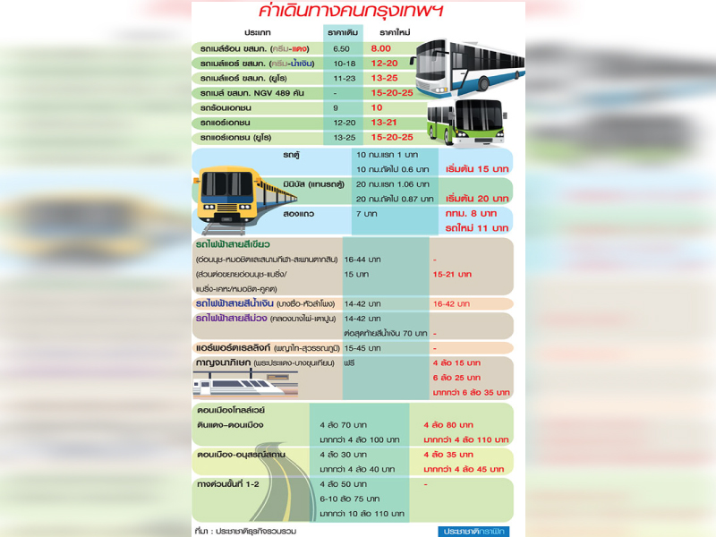 รถตู้ เริ่มต้นที่ 15 บาท การคิดค่าโดยสาร 20 กม.แรก กม.ละ 1.20 บาท และมากกว่า 20 กม. กม.ละ 0.80 บาท รถสองแถว ในกทม.ไม่เกิน 8 บาท และรถใหม่ ไม่เกิน 11 บาท