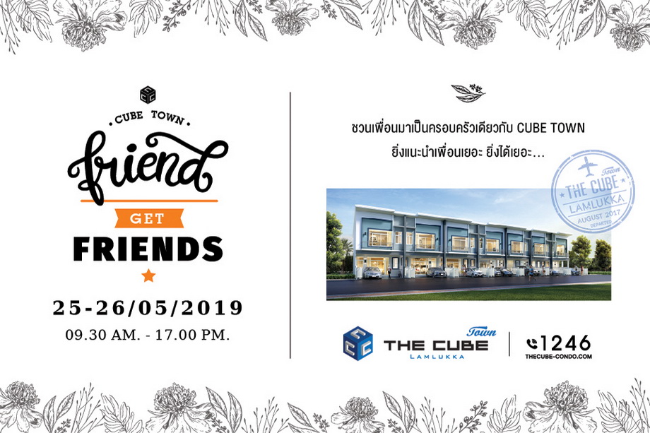 พัฒนาและบริหารงานโครงการโดย บริษัท คิวบ์ เรียล พร็อพเพอร์ตี้ จำกัด จัดงาน Friend Get Friends (เฟรนด์เกทเฟรนด์) ชวนเพื่อนชมบ้านมาเป็นครอบครัวเดียวกับ Cube Town ระหว่าง วันที่ 25-26 พฤษภาคม 2562 เปิดชมบ้านจริงในบรรยากาศอบอุ่น ราคาเริ่มต้น 1.89 ล้านบาท* พร้อมเงื่อนไขพิเศษ ฟรี..ค่าใช้จ่ายวันโอนกรรมสิทธิ์* และยื่นกู้สินเชื่อซื้อบ้านได้ 100%