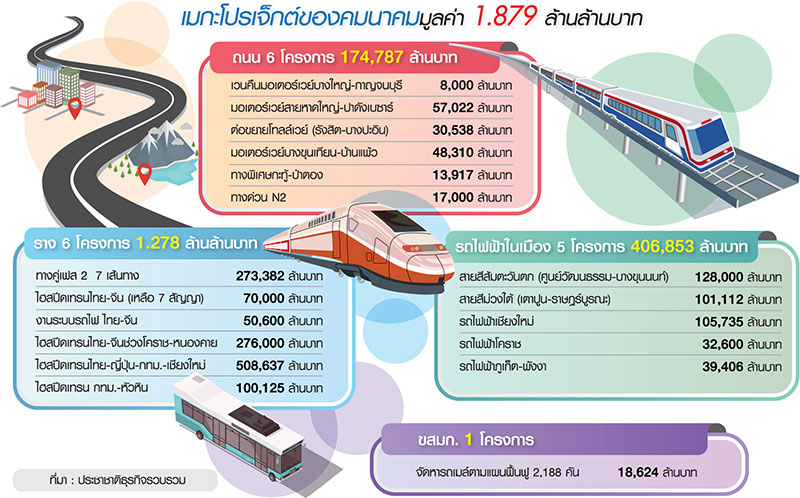 แต่ก็เข็นโครงการจนเริ่มการก่อสร้าง โดยเฉพาะโครงการอยู่ภายใต้การดูแลของ “ร.ฟ.ท.-การรถไฟแห่งประเทศไทย” ไม่ว่า รถไฟทางคู่เฟสแรก 7 เส้นทาง ระยะทางรวม 993 กม. เงินลงทุนกว่า 113,660 ล้านบาท