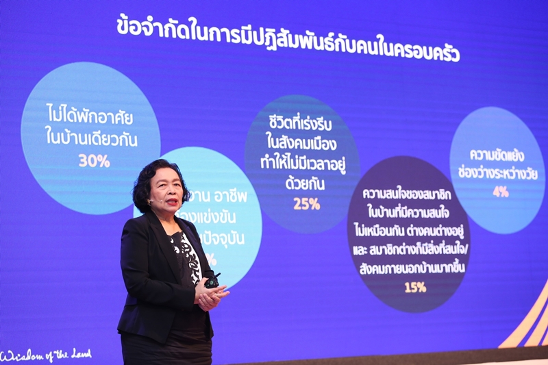 พร้อมเผยผลวิจัย Intergeneration Family เป็นครั้งแรกของประเทศไทย งานฟอรั่มเปิดฉากด้วยการฉายภาพรวมให้เห็นถึงความคิดเห็นของคนไทยต่อเทรนด์การอยู่อาศัยในครอบครัวหลายช่วงวัย โดย ผศ.ดร.พิมลพรรณ อิศรภักดี ที่ปรึกษาและอาจารย์พิเศษ สถาบันวิจัยประชากรและสังคม มหาวิทยาลัยมหิดล เผยถึงโครงสร้างครอบครัวไทยในอดีตประกอบด้วยครอบครัวเดี่ยวและครอบครัวขยายเท่านั้น