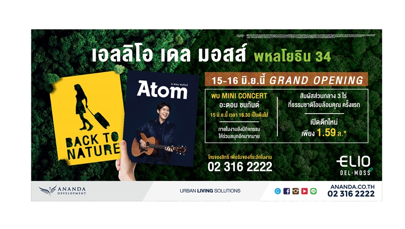 Elio Del Moss Grand Opening ชมโครงการจริง สัมผัสพื้นที่ส่วนกลางกว่า 3 ไร่ ที่ที่ธรรมชาติจะโอบล้มตัวคุณ ใกล้ชิดธรรมชาติกลางกรุง พร้อมเปิดตึกใหม่ราคาพิเศษ เพียง 1.59 ล้านบาท จองเพียง 5,000 บาท เข้าอยู่ได้ทันที พิเศษ! สนุกกับ Mini Concert สุด Exclusive จาก ATOM ชนกันต์ ฟรี! ไม่เสียค่าใช้จ่าย วันที่ 15-16 มิถุนายน ที่โครงการ Elio Del Moss พหลโยธิน 34