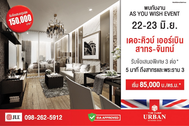 The Cube Urban Sathorn-Chan (เดอะคิวบ์ เออร์เบิน สาทร-จันทน์) คอนโดมิเนียมโลว์ไรส์ (Low Rise) 8 ชั้น สไตล์อังกฤษ จาก บริษัท คิวบ์ เรียล พร็อพเพอร์ตี้ จำกัด จัดกิจกรรมพิเศษ ‘As You Wish Event เปิดชมโครงการทุกองศา’ รับข้อเสนอพิเศษ 3 ต่อ* วันที่ 22-23 มิถุนายน 2562 ณ สำนักงานขาย The Cube