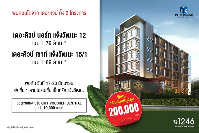 ทุกยูนิตที่จองและทำสัญญากับโครงการภายในงานรับบัตรของขวัญ (Gift Voucher) ในเครือเซ็นทรัล มูลค่า 10,000 บาท* พร้อมรับส่วนลดและเงื่อนไขพิเศษสุดได้ที่บูท (*ของมีจำนวนจำกัดและเงื่อนไขเป็นไปตามที่บริษัทกำหนด) สำหรับ The Cube North Chaengwattana 12 เริ่ม 1.79 ล้านบาท* และ The Cube South Chaengwattana 15/1 เริ่ม 1.89 ล้านบาท*
