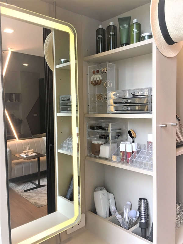 จะดีแค่ไหน?? หากสาย Make Up มีมุมเก็บเครื่องสำอางที่เป็นมากกว่าโต๊ะเครื่องแป้งที่คุ้นเคย ด้วยสัดส่วนที่ลงตัว ประหยัดพื้นที่ ประหยัดเวลา แถมใช้ชีวิตได้ง่ายขึ้น ใส่ใจแม้แต่ ช่องเสียบอุปกรณ์ทำผมและเครื่องใช้ไฟฟ้า เพื่อให้หยิบง่ายใช้คล่อง พร้อม เทคนิคการจัดแสงไฟ ที่ใกล้เคียงแสงธรรมชาติมากที่สุด เพื่อการแต่งหน้าที่ไม่ผิดเพี้ยน บอกลาหน้าเทา สู่ความสวยเป๊ะตั้งแต่ในบ้านยันนอกบ้าน เหมือนออกมาจากบิวตี้ซาลอนแถวบ้านเลยทีเดียว
