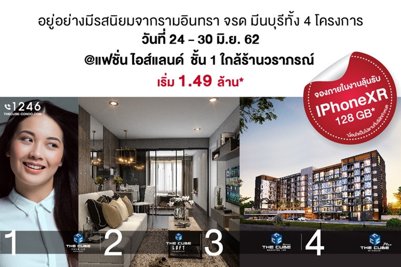 มีโครงการสร้างเสร็จใหม่พร้อมเข้าพักอาศัย อยู่ระหว่างดำเนินการก่อสร้าง และพรีเซล รวม 4 โครงการ ใกล้รถไฟฟ้าสายสีชมพู (แคราย – มีนบุรี) จัดบูทในคอนเซ็ปต์ ‘อยู่อย่างมีรสนิยมจากรามอินทรา จรด มีนบุรี’ ในราคาพิเศษ พร้อมโปรโมชั่นพิเศษ 2 ต่อ สำหรับท่านที่จองและทำสัญญาทุกยูนิตภายในงานลุ้นรับฟรี สมาร์ทโฟน iPhone XR 128 GB* ระหว่างวันที่ 24-30 มิถุนายน 2562 ที่บูท The Cube Condominium ชั้น 1 ลานโปรโมชั่น (ใกล้ร้านวราภรณ์) ศูนย์การค้าแฟชั่นไอส์แลนด์