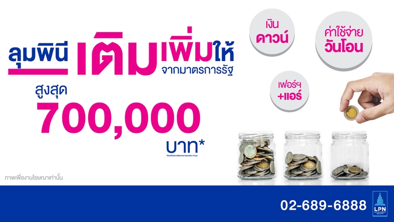 LPN สานฝันคนอยากมีบ้าน พร้อมกระตุ้นตลาดอสังหาฯ คึกคัก จัดโปรเด็ดสบายกระเป๋า “ลุมพินี เติม เพิ่มให้” ฟรีเงินดาวน์-เฟอร์นิเจอร์-เครื่องปรับอากาศ-ค่าใช้จ่ายวันโอนกรรมสิทธิ์ พร้อมมอบส่วนลดสูงสุด 7 แสน ทั้งบ้านและคอนโดพร้อมอยู่ กับ 13 โครงการบนทำเลคุณภาพ คอนโดเริ่มที่ 1.16 ลบ. และบ้านเริ่มที่ 1.79 ลบ. ตั้งแต่วันนี้-30 มิ.ย. ที่สำนักงานขาย LPN ทุกโครงการ