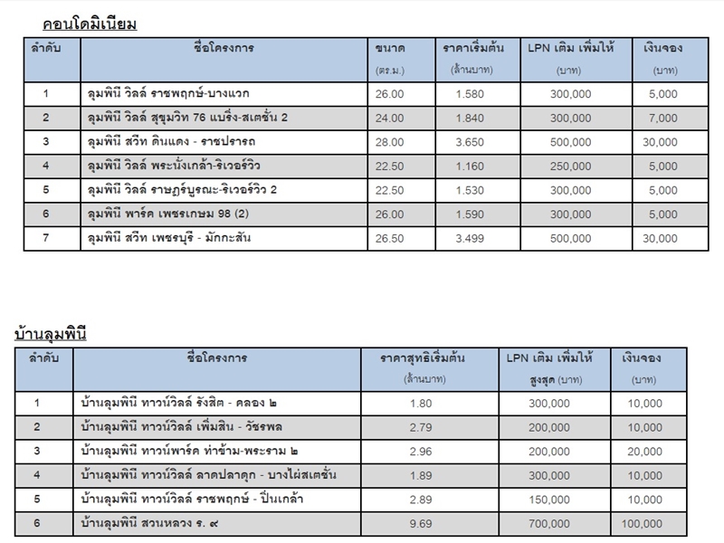 โดยในส่วนของคอนโดมิเนียมนั้น ราคาเริ่มต้นที่ 1,160,000 บาท เงินจอง 5,000 บาท กับ 7 ทำเลในเมือง ส่วนบ้านเดี่ยวและทาวน์เฮ้าส์ ราคาเริ่มที่ 1,800,000 บาท เงินจอง 10,000 บาท กับ 6 ทำเลพร้อมอยู่ โดยมูลค่ารวมที่ LPN เติมเพิ่มให้สูงสุดถึง 700,000 บาท