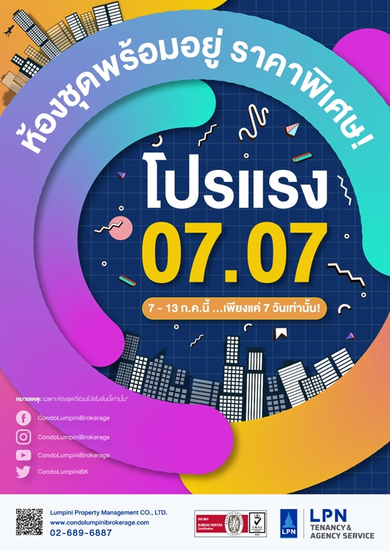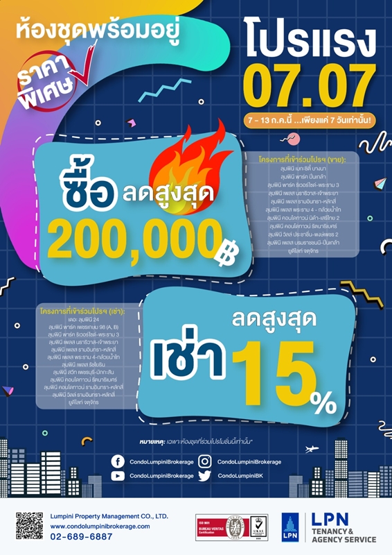 บริษัท ลุมพินี พรอพเพอร์ตี้ มาเนจเมนท์ จำกัด (LPP) ผู้ดำเนินธุรกิจให้บริการบริหารชุมชนแบบครบวงจรอย่างมืออาชีพ จัดทีม Condo Lumpini Brokerage ที่ปรึกษาและบริการบริหารทรัพย์สินฝากขายเช่าในทุกโครงการ ชวนเจ้าของร่วมที่สนใจรับบริการฝากขาย-เช่า ส่งห้องชุดพร้อมอยู่ทุกโครงการในเครือ บริษัท แอล.พี.เอ็น. ดีเวลลอปเมนท์ จำกัด (มหาชน) (LPN) ย่านใจกลางเมืองและทุกทำเลทั่วกรุง และร่วมเสิร์ฟ “โปรแรง 07/07” ซื้อ ลดสูงสุด 200,000 บาท เช่า ลดสูงสุด 15% กว่า 20 โครงการ (เฉพาะโครงการและยูนิตที่ร่วมโปรโมชั่นเท่านั้น)