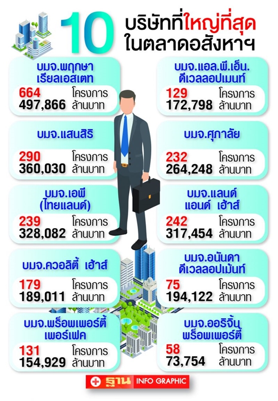 ในจำนวนนี้ บริษัทพัฒนาอสังหาริมทรัพย์อันดับ 1 คือ บมจ.พฤกษา เรียลเอสเตท ซึ่งพัฒนาโครงการรวมทั้งหมด 664 แห่ง รวมหน่วยขาย 232,438 หน่วย มีมูลค่ารวม 497,866 ล้านบาทซึ่งบริษัทรายนี้สร้างที่อยู่อาศัยมากกว่าการเคหะแห่งชาติเสียอีก