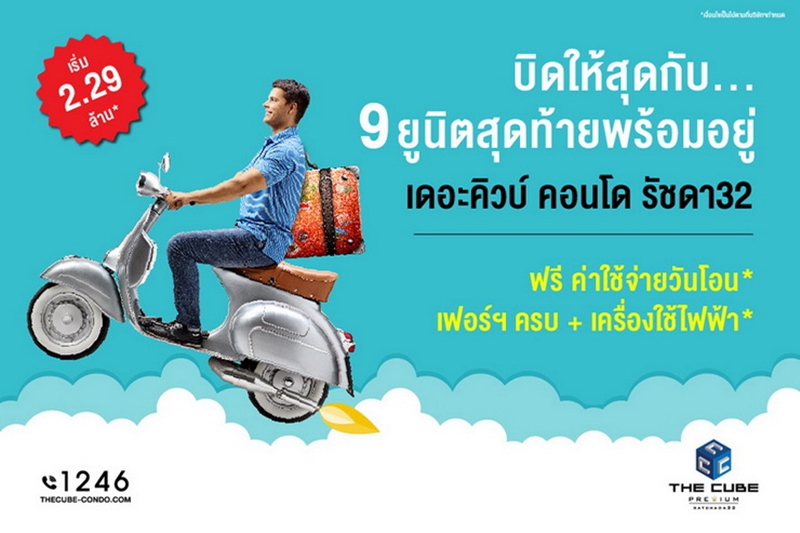 พัฒนาและบริหารงานโดย บริษัท คิวบ์ เรียล พร็อพเพอร์ตี้ จำกัด จัดโปรโมชั่น ‘บิดให้สุดกับ 9 ยูนิตสุดท้ายพร้อมอยู่’ ราคาเริ่มต้น 2.29 ล้านบาท* พร้อมรับฟรี ค่าใช้จ่ายวันโอนกรรมสิทธิ์* รับเฟอร์นิเจอร์ครบทุกฟังก์ชั่น (Fully Furnished) จากแบรนด์ Modernform และเครื่องใช้ไฟฟ้า* มีขนาดตั้งแต่ 25 - 34.5 ตารางเมตร
