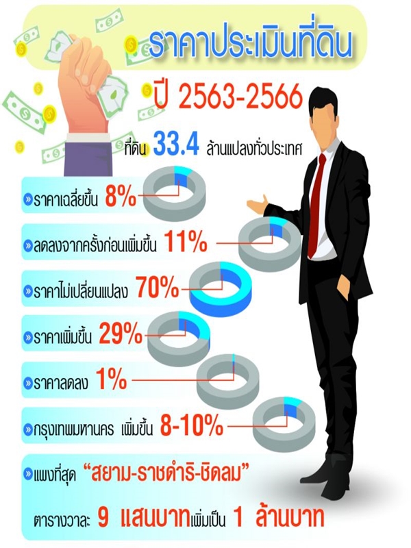 ทั้งนี้ราคาประเมินที่ดินทั่วประเทศที่เตรียมจะประกาศในปี 2563 ราคาเฉลี่ยปรับเพิ่มขึ้นทั่วประเทศ 8% ลดลงจากราคาประเมินรอบปี 2559-2562 ที่มีค่าเฉลี่ยปรับเพิ่มขึ้น 11% เนื่องจากฐานที่ดินที่นำมาประเมินเพิ่มขึ้น โดยที่ดินทั้งหมด 33.4 ล้านแปลงนั้นราคาไม่มีการเปลี่ยนแปลง 70% ขณะที่ราคาเพิ่มขึ้น 29% และมีเพียง 1% ที่ราคาปรับลดลง ซึ่งอยู่ในพื้นที่อยู่ลึกมากๆ