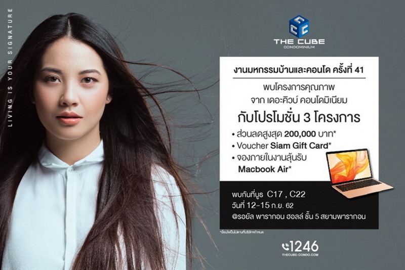 บริษัท คิวบ์ เรียล พร็อพเพอร์ตี้ จำกัด ผู้พัฒนาและบริหารอสังหาริมทรัพย์โครงการ The Cube Condominium (เดอะคิวบ์ คอนโดมิเนียม) นำ 3 คอนโดมิเนียมบนทำเลศักยภาพใกล้รถไฟฟ้า แหล่งงาน ย่านธุรกิจ ร่วมจัดโปรโมชั่นในงาน ‘มหกรรมบ้านและคอนโด ครั้งที่ 41’ (Housing and Condo Show 2019) ระหว่างวันที่ 12-15 กันยายน 2562 ที่บูธ The Cube Condominium (C17, C22) ณ รอยัล พารากอน ฮอลล์ ชั้น 5 ศูนย์การค้าสยามพารากอน