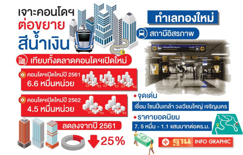อย่างไรก็ตาม การเกิดขึ้นอย่างเป็นรูปธรรมของรถไฟฟ้าสายใหม่ ถือเป็นปัจจัยบวก พยุงตลาด ส่งผลให้เกิดทำเลใหม่ ๆ ที่ดินมีมูลค่าเพิ่มขึ้น และก่อให้เกิดความต้องการด้านที่อยู่อาศัยตามมา โดยเฉพาะโอกาสของตลาดคอนโดฯ หลัก ราคา 2-5 ล้านบาท ย่านฝั่งธนบุรี จากการเปิดให้บริการเต็มรูปแบบของรถไฟฟ้าสายสีนํ้าเงินส่วนต่อขยายหัวลำโพง-หลักสอง และจะวิ่งครบลูปในอนาคต
