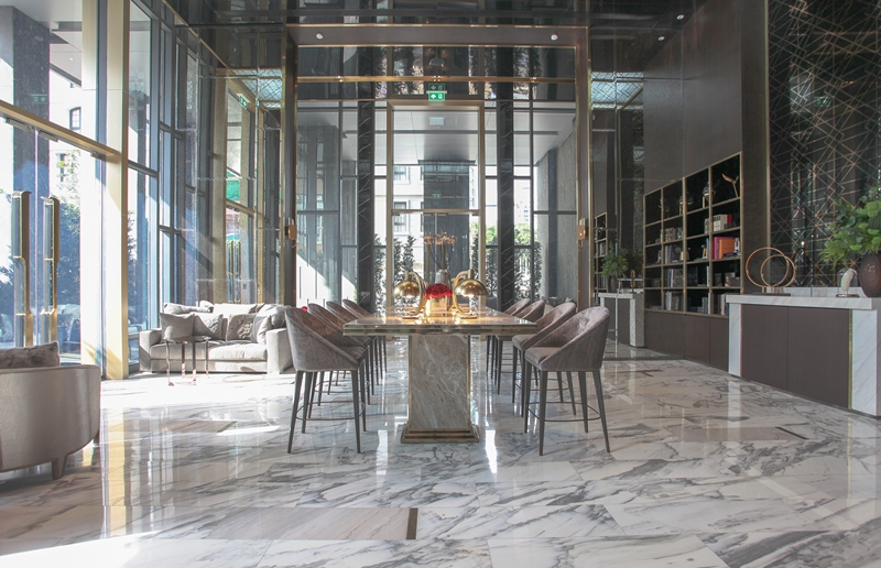 ตั้งแต่การออกแบบภูมิสถาปัตยกรรมของชั้น G เป็นลักษณะสวนปิดล้อมพื้นที่ด้วยเนินธรรมชาติเพื่อความร่มรื่นและเป็นส่วนตัว ดีไซน์ให้เชื่อมต่อกับพื้นที่ห้องสมุดอันโอ่อ่าและตระการตากับล็อบบี้ตกแต่งสุดหรูด้วยเปียโนสีขาวคลาสสิก (Ivory Piano Bar) ซึ่งเป็น Signature ของ FENDI CASA เฟอร์นิเจอร์สุดลักชัวรี่ มาประดับตกแต่งล็อบบี้ของโครงการ