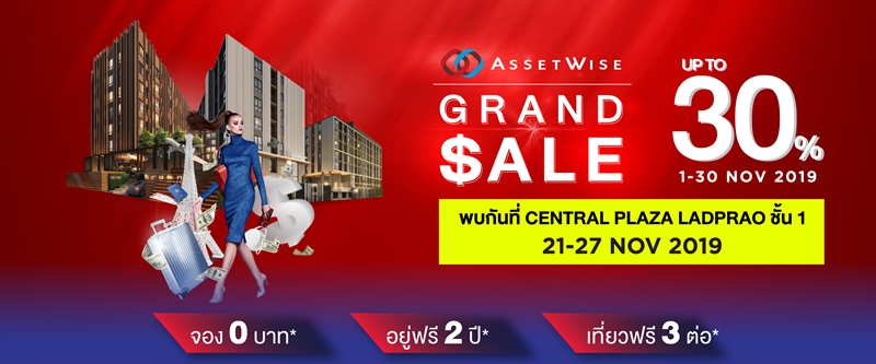 แอสเซทไวส์ เตรียมจัดงานใหญ่แห่งปี “AssetWise GRAND SALE” หนุนมาตรการกระตุ้นภาคอสังหาฯ ขนทัพทุกโครงการอัดโปรโมชั่นสุดแรงส่งท้ายปี ลดราคาสูงสุด 30% พร้อมรับสิทธิพิเศษมากมาย ตั้งแต่วันที่ 21 - 27 พฤศจิกายน 2562 ณ เซ็นทรัลพลาซา ลาดพร้าว