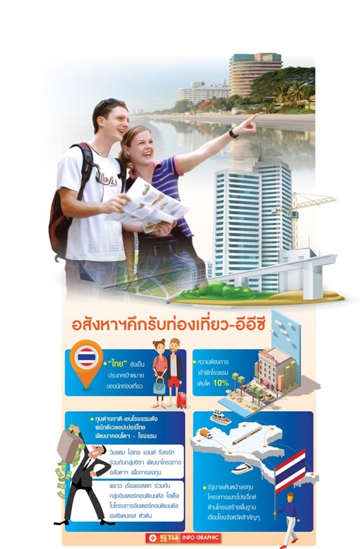 มาตรการส่งเสริมภาคการท่องเที่ยว กระตุ้นนักท่องเที่ยวทั้งในและนอกประเทศของภาครัฐ ประกอบกับแผนพัฒนาโครงสร้างพื้นฐาน ไปยังจังหวัดสำคัญของไทย กลายเป็นแม่เหล็กดึงดูดชั้นดีให้กับเมืองท่องเที่ยวหลักอย่าง ภูเก็ต พัทยา และหัวหิน พบเชนโรงแรมดังระดับโลกหลายแบรนด์ ยังจับมือผู้ประกอบการไทยเข้าพัฒนาทั้งกลุ่มโรงแรมและโครงการที่อยู่อาศัยชั้นดี เจาะดีมานด์ลูกค้าทุกระดับเติบโต ระบุรายได้ท่องเที่ยวกลุ่มประเทศภูมิภาคตะวันออกเฉียงใต้มาแรงแซงทุกประเทศ