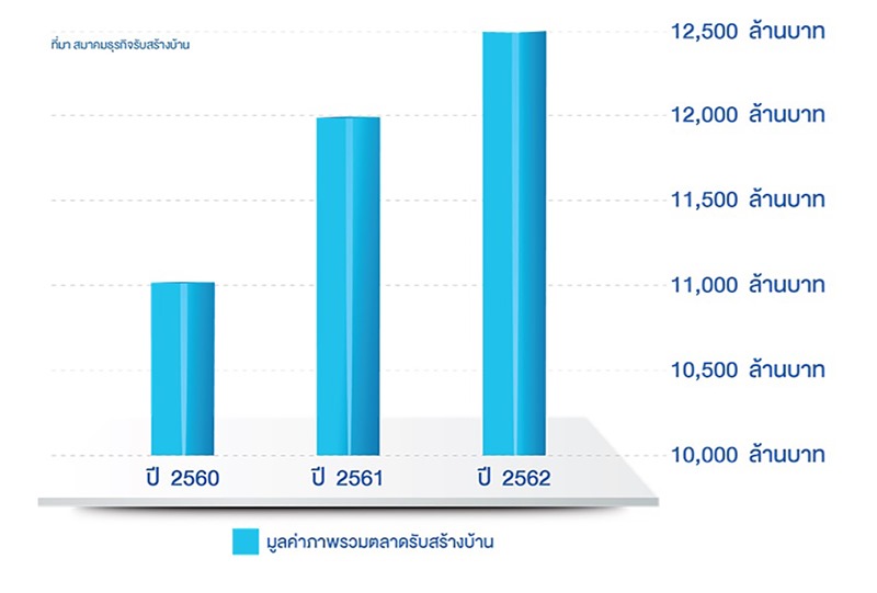 นางศิริพร สิงหรัญ นายกสมาคมธุรกิจรับสร้างบ้าน เปิดเผยว่า ภาพรวมตลาดรับสร้างบ้านปี 2562 มีมูลค่าตลาดรวมราว 12,500 ล้านบาท เพิ่มขึ้นประมาณ 5% เมื่อเทียบกับปี 2561 ที่มีมูลค่าตลาดรวม 12,000 ล้านบาท โดยภาพรวมเศรษฐกิจของประเทศในปีนี้ ส่งผลกระทบกับตลาดรับสร้างบ้านพอสมควร โดยเฉพาะความเชื่อมั่นของผู้บริโภคที่มีระยะเวลาการตัดสินใจในการเลือกสร้างบ้านที่นานขึ้น