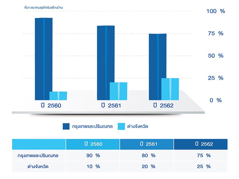โดยเมื่อปี 2560 สัดส่วนของการปลูกสร้างบ้านในกรุงเทพและปริมณฑล และต่างจังหวัดจะอยู่ที่ 90:10% ปี 2561 สัดส่วนปรับเป็น 80:20% ขณะที่ในปีนี้ สัดส่วนในต่างจังหวัดยังคงมีปริมาณมากขึ้นมาอยู่ที่ 75:25% การที่ตลาดในต่างจังหวัดขยายตัวเพิ่มขึ้นมีเหตุผลมาจาก บริษัทรับสร้างบ้านหลายบริษัทขยายการทำธุรกิจไปยังพื้นที่ต่างจังหวัดที่มีศักยภาพมากขึ้น