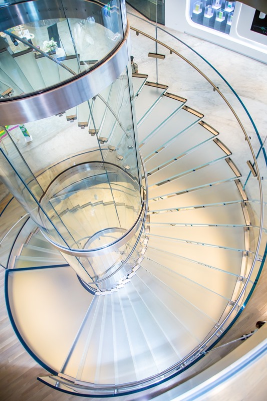 โดยมีลักษณะเป็นโถงบันไดเวียนทรงกระบอก แกนกลางมีโครงสร้างเป็นรูปทรงกระบอกแก้วขนาดใหญ่ ผนังของโถงบันได แผงราวกันตกและขั้นบันได ล้วนแต่ใช้เทคโนโลยีขั้นสูงในการผลิตแผ่นกระจกขนาดใหญ่ ที่มีความสูงหลายเมตร การขนส่ง การประกอบ ติดตั้งและเชื่อมต่อ ทุกองค์ประกอบต้องมีความสมมาตรเท่ากันเพื่อให้มั่นคงรับน้ำหนักได้เป็นอย่างดี อีกทั้งยังสวยงามร่วมสมัย เพื่อให้เกิดเป็นบันไดแก้วที่เชื่อมโยงกลุ่มคนรุ่นใหม่ยุคดิจิทัลเพื่อการเรียนรู้นวัตกรรมที่สมบูรณ์เข้าไว้ด้วยกัน