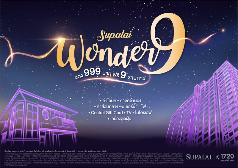 บริษัท ศุภาลัย จำกัด (มหาชน) โดย นางสาวธัญวรัตน์ ปัญญารัตน์ ผู้ช่วยกรรมการผู้จัดการ ฝ่ายการตลาดและการขาย กล่าวว่า บริษัทฯ ลุยตลาดอสังหาริมทรัพย์ต้อนรับปี 2563 จัดโปรโมชั่นสุดคุ้มเป็นของขวัญให้กับลูกค้าเพื่อกระตุ้นการตัดสินใจกับ “Supalai Wonder 9 จอง 999 บาท ฟรี 9 รายการ”
