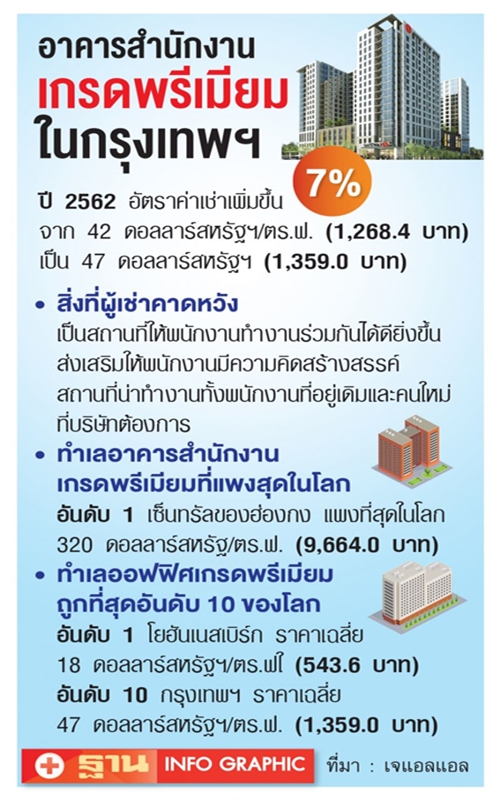 เจแอลแอล บริษัทที่ปรึกษาและบริการด้านอสังหาริมทรัพย์ รายงานการวิจัยค่าเช่าพื้นที่อาคารสำนักงานเกรดพรีเมียม ในย่านธุรกิจสำคัญ 86 ทำเลของ 73 เมืองใหญ่ทั่วโลก ในปีนี้ กรุงเทพฯ มีอัตราค่าเช่าเฉลี่ยสำหรับพื้นที่สำนักงานเกรดพรีเมียมอยู่ที่ 45 ดอลลาร์สหรัฐฯ ต่อตารางฟุตต่อปี เพิ่มขึ้น 7% จากปี 2561 ที่มีค่าเช่าเฉลี่ย 42 ดอลลาร์สหรัฐฯ