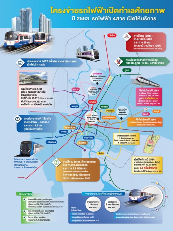 จากการเปิดให้บริการโครงข่ายรถไฟฟ้าในปี 2563 ถึง 4 สาย ส่งผลให้พื้นที่อสังหาริมทรัพย์ริมเส้นทางรถไฟฟ้าผ่านเป็นทำเลศักยภาพ ราคาที่ดินพุ่งสูงขึ้น บริษัทอสังหาริมทรัพย์ยักษ์ใหญ่หลายรายเข้าไปจับจองพื้นที่ ฐานเศรษฐกิจได้รวบรวม 10 ทำเลที่ดินศักยภาพโครงข่ายรถไฟฟ้า ในพื้นที่สะพานควาย หมอชิต ห้าแยกลาดพร้าว แยกรัชโยธิน พระราม 9-รัชดา แจ้งวัฒนะ-เมืองทอง โชคชัย 4 และ เยาวราช ซึ่งในบางพื้นที่มีราคาที่ดินสูงถึง 1 ล้านบาท/ตร.ว.