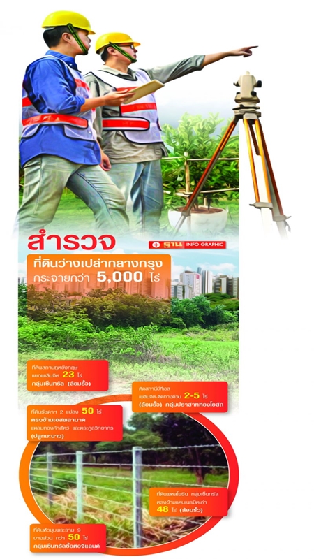 แหล่งข่าวจากกทม. ระบุว่า ขณะนี้อยู่ระหว่างสำรวจที่ดินรกร้างในเขตกทม. ทั้ง 50 เขต พื้นที่ 15,000 ตารางเมตร พบว่ายังมีที่ดินทิ้งร้างไม่ทำประโยชน์กระจายอยู่ทั่วไป มีทั้งพื้นที่กรุงเทพฯ ชั้นใน แนวรถไฟฟ้า ซึ่งส่วนใหญ่มีการถมดินไม่มีการปลูกสร้างอาคาร ล่าสุดได้ขีดแนวไว้ เพื่อนำไปหารือขอบเขตในทางปฏิบัติว่าที่ดินลักษณะดังกล่าวอยู่ในข่ายทิ้งร้างหรือไม่ อย่างไรก็ตาม หากตรวจสอบพบว่ามีใบอนุญาตก่อสร้างอาคารแล้ว ก็เข้าใจได้ว่าอยู่ในกระบวนการก่อสร้าง แต่ถ้ายังไม่มีใบอนุญาต ต้องเข้าข่ายที่ดินรกร้าง