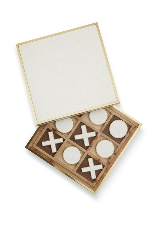 เกมที่สมบูรณ์แบบสำหรับทุกคนในครอบครัวชุด Tic Tac Toe นี้ได้รับการยกระดับอย่างหรูหรา พร้อมฐานฝังไม้ที่ทำจากไม้วอลนัทและไม้บีช ตกแต่งชิ้นส่วนของลายนูนที่ขอบด้วยทองเหลือง กล่องสี่เหลี่ยมที่มีรายละเอียดการตกแต่งด้วยทองเหลือง ช่วยให้สามารถจัดเก็บไว้อย่างสวยงาม บนชั้นวางหนังสือหรือโต๊ะ