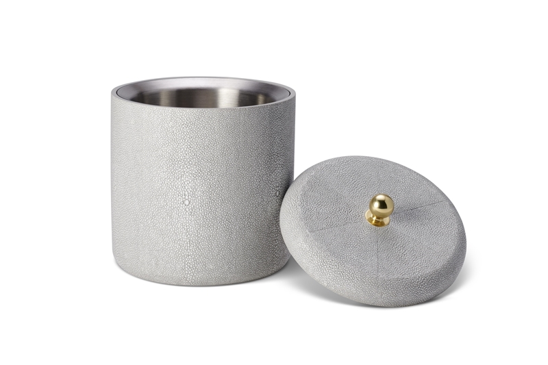 ถังน้ำแข็งทรงกลมทำจากหนังกระเบนพร้อมที่จับทองเหลืองบริเวณฝา ภายในบุด้วย สเตนเลส สตีลสองชั้น เข้าชุดกับอุปกรณ์บาร์ในคอลเล็กชั่น Barware ของ AERIN เพื่อสร้างโฮมบาร์ ที่หรูหราให้กับบ้านของคุณ