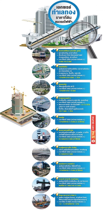 ไม่เฉพาะพื้นที่ใจกลางเมืองที่เต็มไปด้วยตึกสูง แต่ทุกเส้นทางรถไฟฟ้าพาดผ่าน ที่นั่นย่อมเกิดทำเลทองใหม่ ราคาที่ดินถูกปั่นจากหลักหมื่นขยับขึ้นหลักแสน ทะลุตารางวาละ 1 ล้านบาทในเวลาอันรวดเร็ว โดยเฉพาะจุดเปลี่ยนถ่ายรถไฟฟ้า