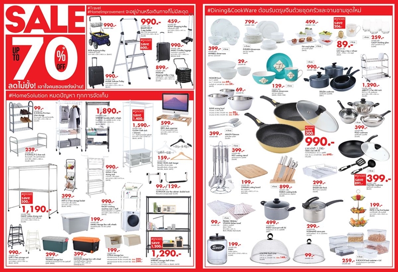 ลดสูงสุด 70% อาทิ โซฟารูปตัวแอล รุ่นมิกซี่/พี ราคา 7,990.- จากเดิม 19,990.-, โครงตู้เสื้อผ้า รุ่นเวลเน็ท/อองเดร ราคา 1,890.- จากเดิม 3,790.-, ชุดห้องนอนรุ่น Vince (เตียง+ตู้เสื้อผ้า 3 บาน+ที่นอน) ราคา 15,990.- จากเดิม 23,460.-, โซฟาปรับระดับ 1 ที่นั่ง รุ่น BONO ราคา 17,900.- จากเดิม 23,890.-, ชุดโต๊ะอาหาร รุ่น Alano (5 ชิ้น-ชุด) ราคา 24,900.- จากเดิม 43,860.- และ สินค้า Home Solutions อาทิ ที่วางของหน้าคอมพิวเตอร์, ตะกร้าวางของ, กล่องอเนกประสงค์, ไม้แขวนเสื้อ, ชั้นวางรองเท้า รวมถึงสินค้าของใช้-ของตกแต่งบ้าน อาทิ กรอบรูป, โคมไฟ, นาฬิกา, รูปปั้น, แจกัน, ชุดจาน, ชุดเครื่องครัว ฯลฯ