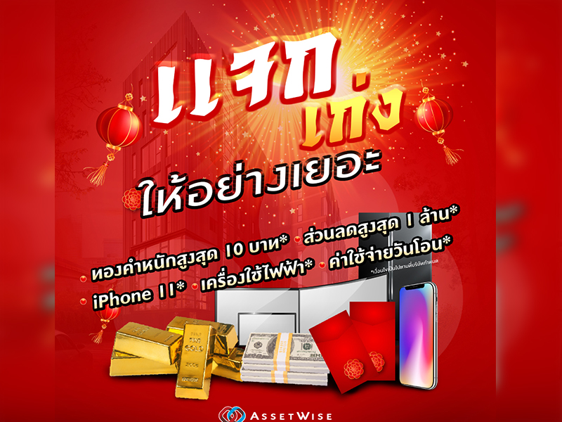 บริษัท แอสเซทไวส์ จำกัด ผู้พัฒนาอสังหาริมทรัพย์ที่มุ่งมั่นสร้างสรรค์ที่อยู่อาศัยคุณภาพ ต้อนรับเทศกาลตรุษจีน กับแคมเปญ "แจกเก่ง" ที่ยกขบวนอั่งเปาเซทใหญ่สุดพิเศษ เพื่อมอบสำหรับลูกค้าที่สนใจเป็นเจ้าของ 18 โครงการคอนโดมิเนียมคุณภาพจากแอสเซทไวส์ มาพร้อมข้อเสนอสุดพิเศษ ฟรีเงินจอง เพียงทำสัญญา 999 บาท ในราคาเริ่มต้นตั้งแต่ 1.31 ล้านบาท
