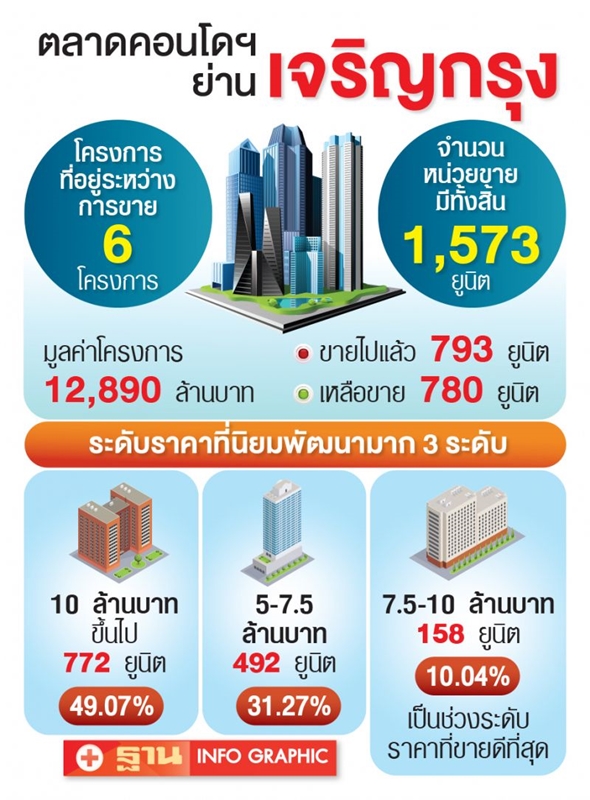 แผนกวิจัยคอลลิเออร์ส อินเตอร์เนชั่นแนล ประเทศไทย สำรวจตลาดคอนโดมิเนียมในย่านเจริญกรุง ณ ปี 2562 มีทั้งหมด 6 โครงการ ประมาณ 1,573 ยูนิต มูลค่าโครงการ 12,890 ล้านบาท ขายไปแล้วประมาณ 793 ยูนิต หรือคิดเป็น 50% ของอุปทานที่อยู่ระหว่างการขายทั้งหมด เหลือขายประมาณ 780 ยูนิต หรือคิดเป็น 50% จากอัตราการขายที่ยังอยู่ในเกณฑ์ที่ค่อนข้างตํ่าเมื่อเทียบกับทำเลอื่น ๆ ในกรุงเทพมหานคร เนื่องจากมีโครงการคอนโดมิเนียมบางโครงการจากผู้ประกอบการรายใหญ่ที่เพิ่งเปิดตัวไปในช่วงปลายปีที่ผ่านมา แต่จะเปิดขายอย่างเป็นทางการช่วงต้นปี 2563 จึงส่งผลให้อัตราการขายยังอยู่ในเกณฑ์ที่ค่อนข้างต่ำ