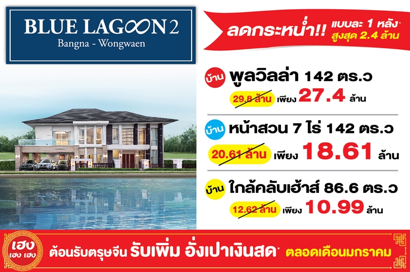 บลูลากูน 2 ลดกระหน่ำ แบบละ 1 หลัง สูงสุด 2.4 ล้านบาท พร้อมแจกอั่งเปาเพิ่ม ต้อนรับเทศกาลตรุษจีน กับ 3 แบบบ้านหรูหลังใหญ่เลือกได้ตามใจ ที่พร้อมเติมเต็มความสุขของทุกคนในครอบครัว