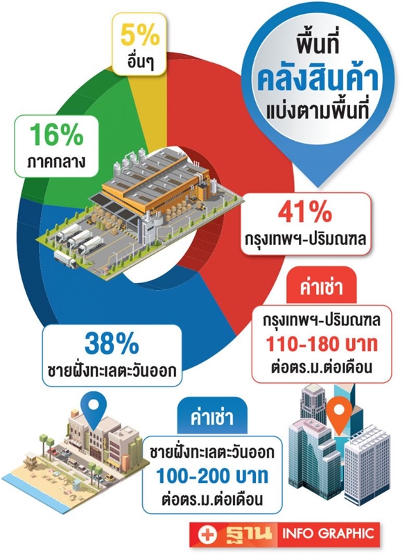 สำหรับความต้องการพื้นที่คลังสินค้า ในช่วงครึ่งแรกของปี 2562 ปรับเพิ่มพื้นที่ครอบครองรวมจำนวน 68,026 ตร.ม. เป็นจำนวนรวมทั้งสิ้น 4,486,787 ตร.ม. ถือเป็นระดับที่ดี โดยมีธุรกิจอี-คอมเมิร์ซเป็นแรงขับเคลื่อนสำคัญต่อความต้องการพื้นที่คลังสินค้า ซึ่งล่าสุดตลาดอี-คอมเมิร์ซมีอัตราการเติบโตที่น่าสนใจ และคาดว่าจะยังคงขยายตัวต่อไปได้อีกในปีถัดไป ถือเป็นปัจจัยสำคัญต่อการเติบโตของตลาดโลจิสติกส์