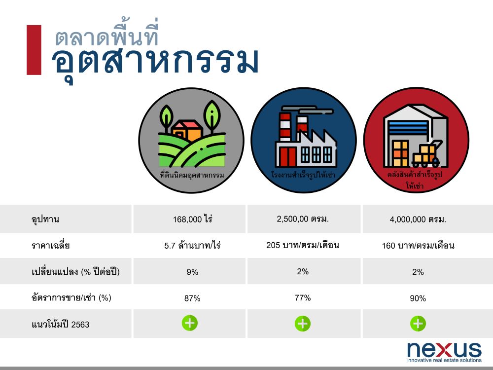เน็กซัสสำรวจภาพรวมตลาดพื้นที่อุตสาหกรรมปี 2562 ที่ผ่านมา พบว่ายังคงมีแนวโน้มการเติบโตอย่างต่อเนื่อง ผลจากการผลักดันของภาครัฐ อีกทั้งโครงการอีอีซีที่เริ่มมีความชัดเจน ทั้งในเรื่องของพื้นที่ สิทธิประโยชน์ และความคืบหน้าของโครงการโครงสร้างพื้นฐาน ส่งผลให้เกิดการซื้อขายที่ดินในเขตอุตสาหกรรมอย่างต่อเนื่อง อย่างดีลใหญ่จากอาลีบาบามูลค่ากว่า 3 พันล้านบาท เมื่อปลายปี ที่สามารถสร้างความคึกคักให้กับตลาดได้เป็นอย่างดี