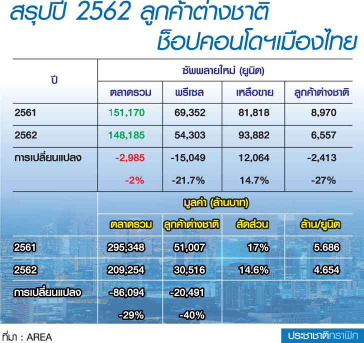 เปรียบเทียบกับปี 2561 ต่างชาติมาซื้อห้องชุดลดลง โดยยอดพรีเซลตลาดรวม 69,352 หน่วย มีต่างชาติซื้อ 8,970 หน่วย สัดส่วน 13% ในด้านมูลค่า เป็นของลูกค้าต่างชาติ 51,507 ล้านบาท สัดส่วน 17% ของตลาดรวม และซื้อในราคาเฉลี่ย 4.65 ล้านบาท/ยูนิต เท่ากับราคาเฉลี่ยในปี 2562