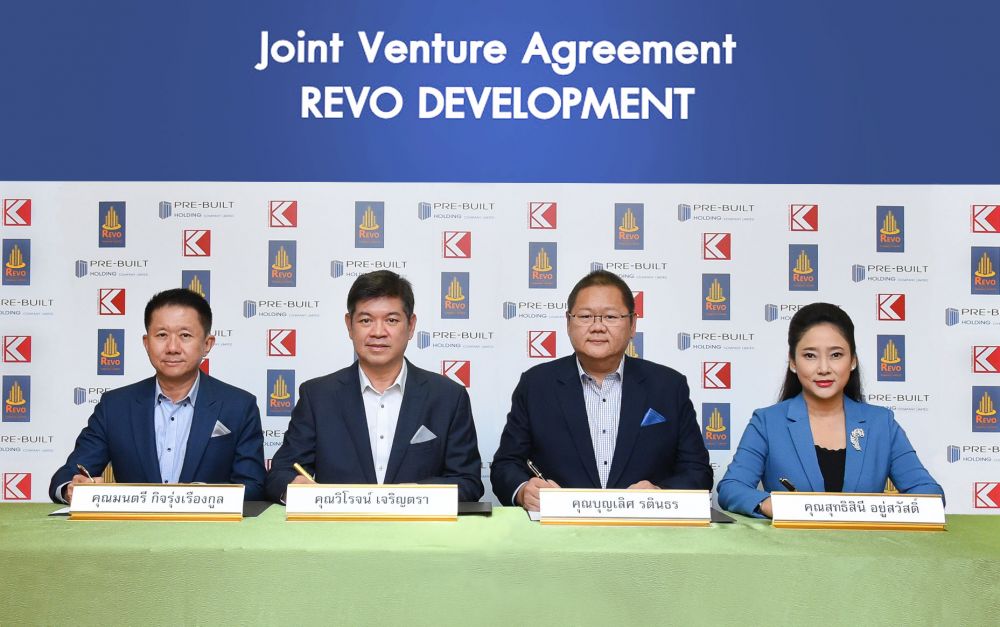นายวิโรจน์ เจริญตรา (ที่ 2 จากซ้าย) กรรมการผู้จัดการ บริษัท พรีบิลท์ จำกัด (มหาชน), นายบุญเลิศ รตินธร (ที่ 3 จากซ้าย) ประธานเจ้าหน้าที่บริหาร, นางสาวสุทธิสินี อยู่สวัสดิ์ (ขวาสุด) กรรมการผู้จัดการ บริษัท รีโว เอสเตท จำกัด และ นายมนตรี กิจรุ่งเรืองกูล (ซ้าย) กรรมการผู้จัดการ บริษัท เค.อาร์.ซี. เอ็นจิเนียริ่ง จำกัด