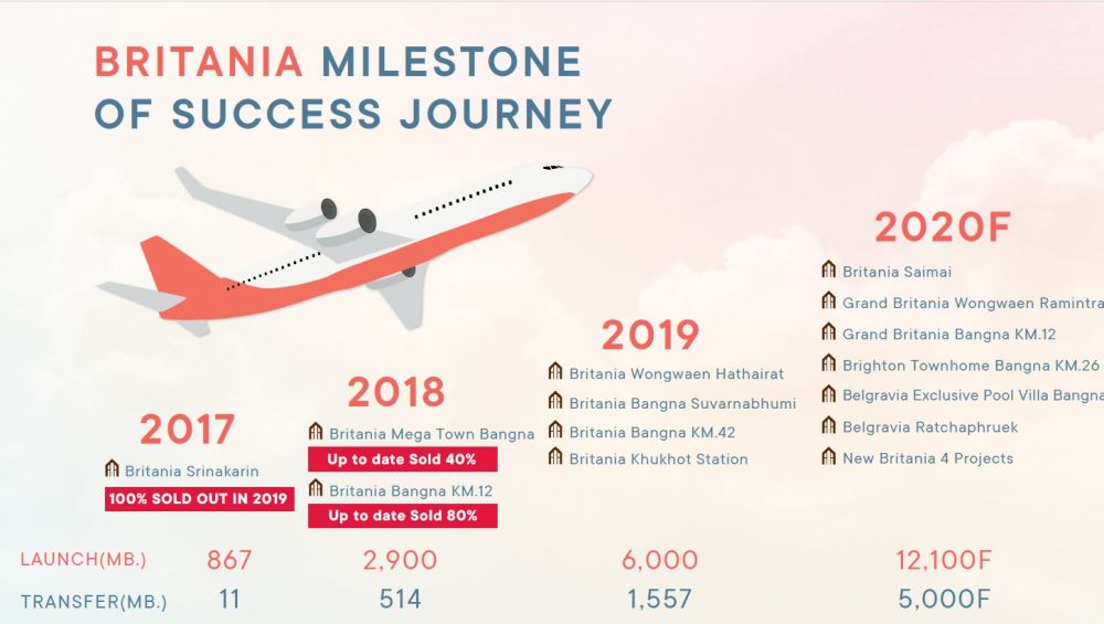 โครงการกลุ่มลักชัวรี่คอนโดมิเนียม 1 โครงการ มูลค่ารวม 2,300 ล้านบาท โครงการกลุ่มบ้านจัดสรร 10 โครงการ มูลค่ารวม 12,100 ล้านบาท ครอบคลุมทั้งแบรนด์บริทาเนีย และแบรนด์ใหม่ 3 แบรนด์ ได้แก่ แกรนด์บริทาเนีย ไบรตัน และเบลกราเวีย โครงการกลุ่มอีอีซี 1 โครงการ มูลค่ารวม 1,400 ล้านบาท ภายใต้แบรนด์เดอะ แฮมป์ตัน (The Hampton) ในศรีราชา
